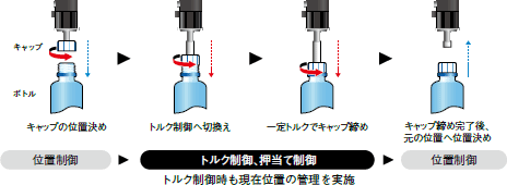 位置決め動作中にモータを停止させずにトルク制御の押当てモードに切換えることができます。