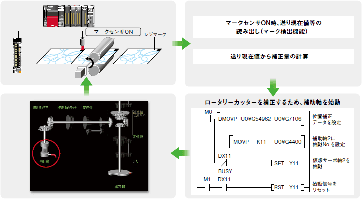 高速で移動する包装紙のレジマークによるセンサ入力で、サーボモータの実現在位置を取得できます。レジマーク入力時のカッター軸の位置を補正することで、包装紙を一定の位置でカットすることができます。