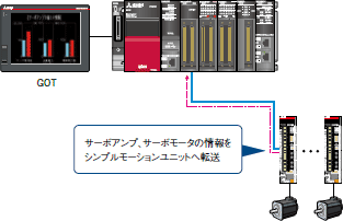 ネットワーク経由で取得したサーボアンプ、サーボモータの情報をお客様作成のGOT画面へ表示できます。機械が必要とする消費電力を把握することで、無駄な電力の削減に役立てることができます。