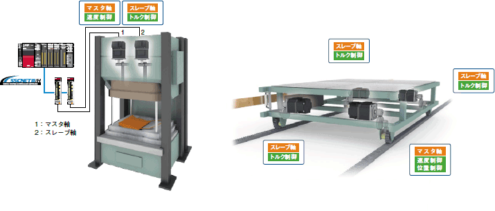 ドライバ間通信機能とサーボアンプのマスタ/スレーブ運転機能を組み合わせて、2軸以上のサーボモータを駆動させることができます。マスタ軸に速度制御を指令すると、ドライバ間通信機能により、スレーブ軸に速度指令に対応したトルク指令が転送されます。