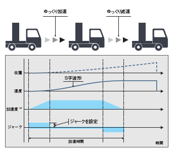 装置が揺れないようにゆっくり加速し、加速中はジャークを保持、一定速度に移る場合、ジャークを戻します。上手にジャーク調整をすれば、なめらかな加速を実現しつつ、目的速度までの時間も短縮することができます。