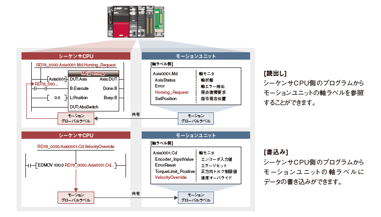 - ●モーションユニットで追加したグローバルラベルは、シーケンサCPUのプログラムで使用できます。