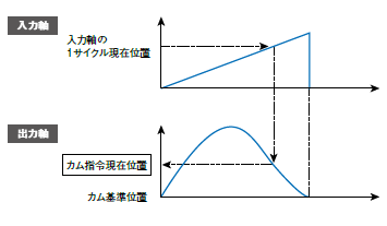 同期制御解析モードでは、入力軸を基準としたカム指令現在位置に更新します。更新されたカム指令現在位置を使用して、同期制御前の同期位置合わせができます。