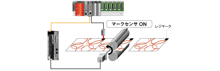 高速で移動する包装紙のレジマークをセンサで読み取り、現在位置をバッファメモリにセットします。マーク検出機能を使用することで、レジマークの位置を補正することができ、包装紙を一定の位置でカットすることができます。