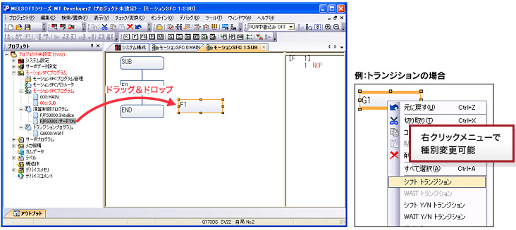 ドラッグ&ドロップで簡単に流用可能(演算制御プログラム/トランジションプログラム/サーボプログラム単位でも可能)