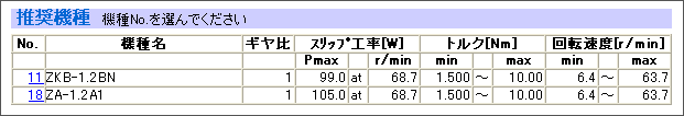 クラッチ選定結果の「クラッチ入力」と「トルク」の値から、ギヤードモータを選定します。