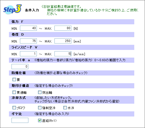 | 条件入力 | 張力:40~80[N] 巻径:75~250[mm] ラインスピード:1~5[m/min] |