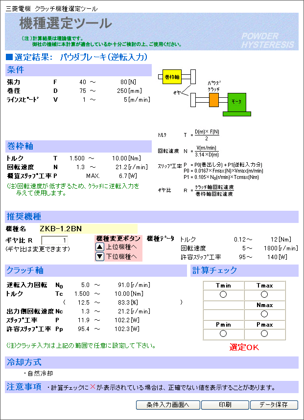 Step1に戻りパウダブレーキ→パウダブレーキ(逆転入力)に変更し再選定を行います。