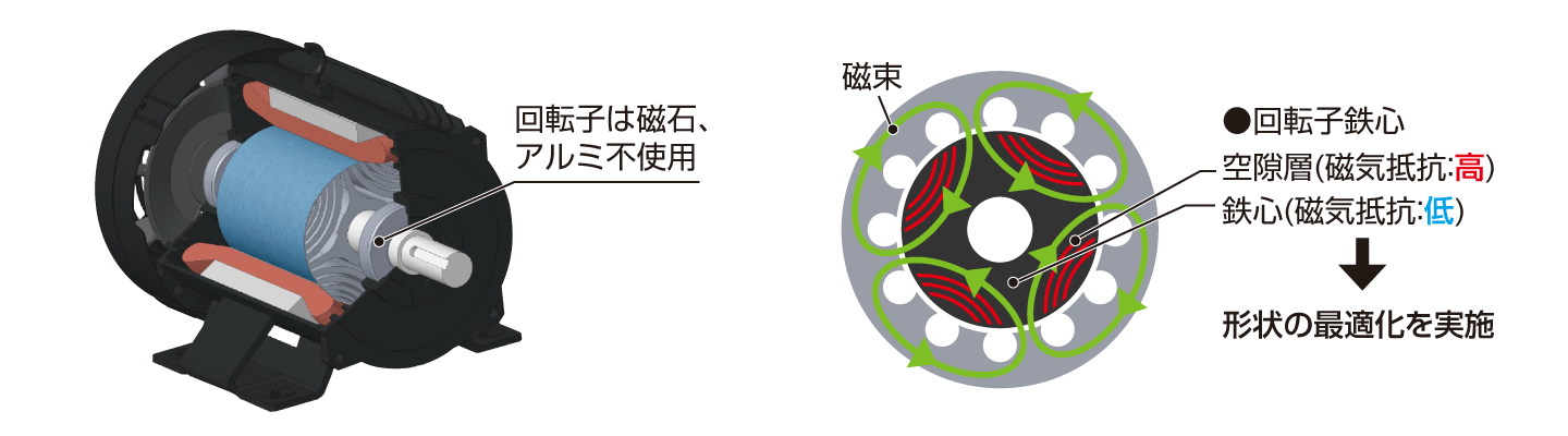- 当社独自の最適化技術により、トレードオフの関係にある高効率化と回転子強度の双方を高いレベルで達成する形状を実現しました。