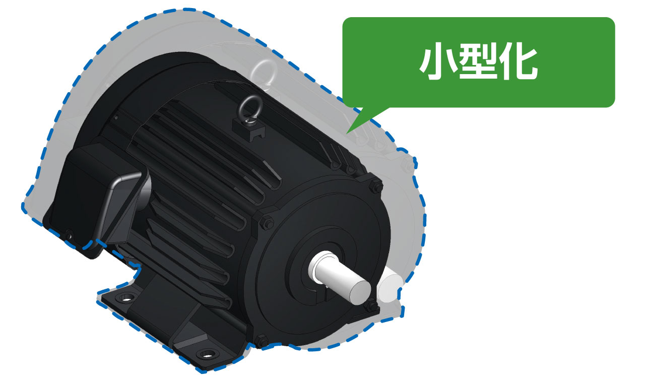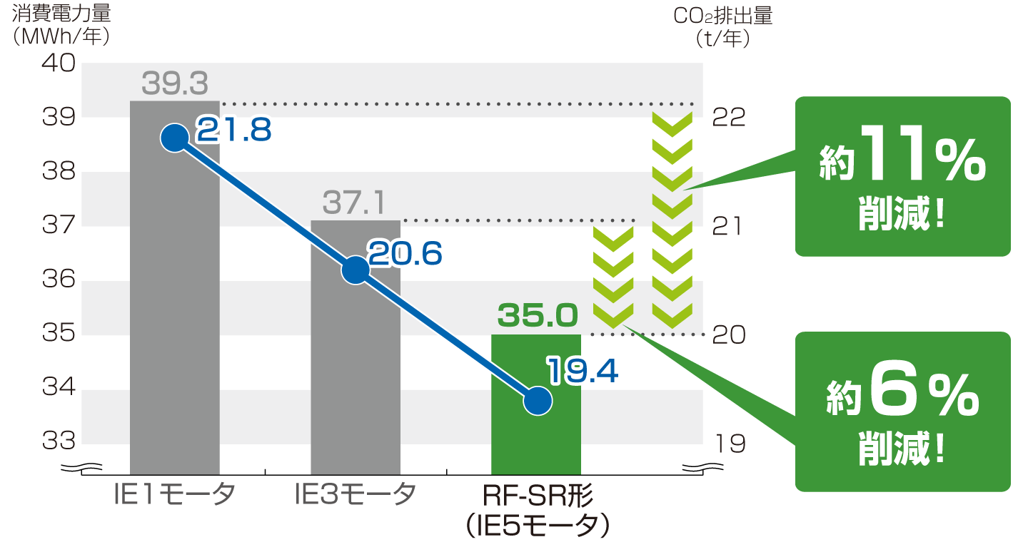 - 効率クラスIE5の達成により、一般的なIE1・IE3モータと比べて消費電力及びCO 2 排出量を削減することができます。