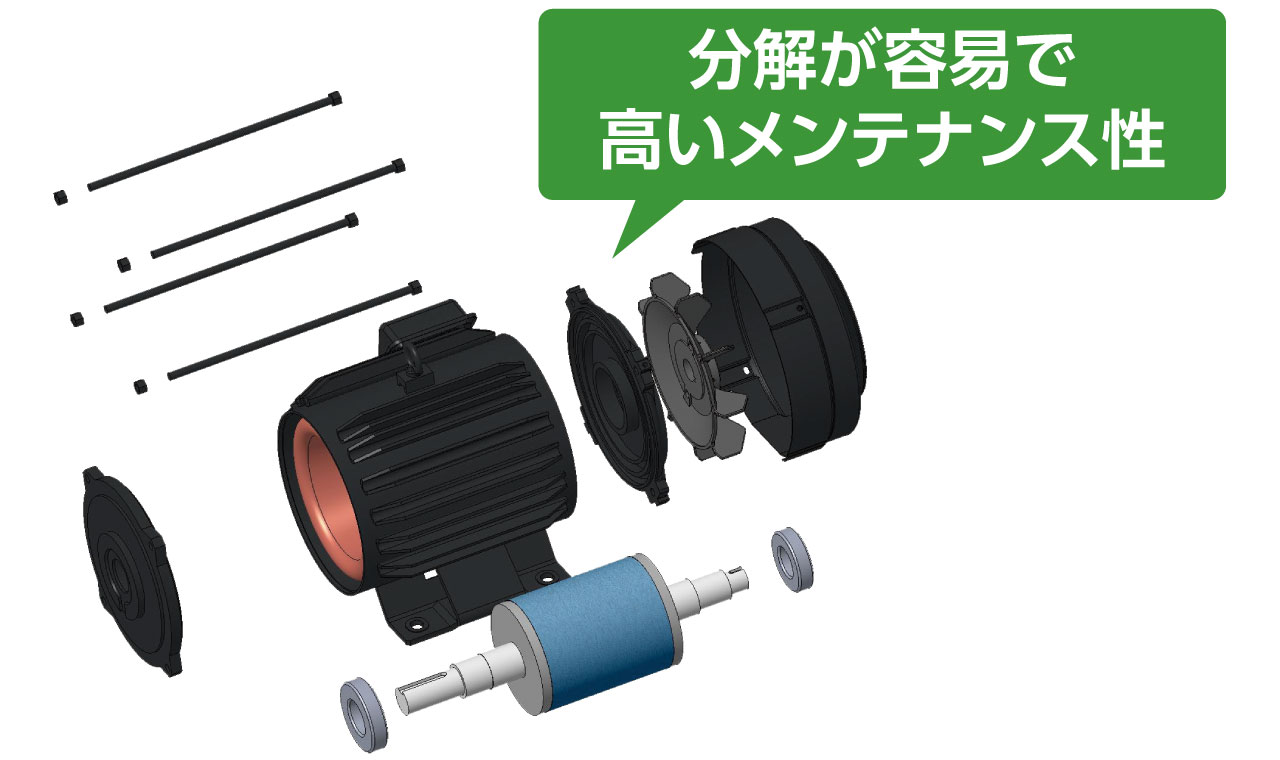 - 永久磁石レス構造のため、モータの分解が容易で高いメンテナンス性を実現しました。