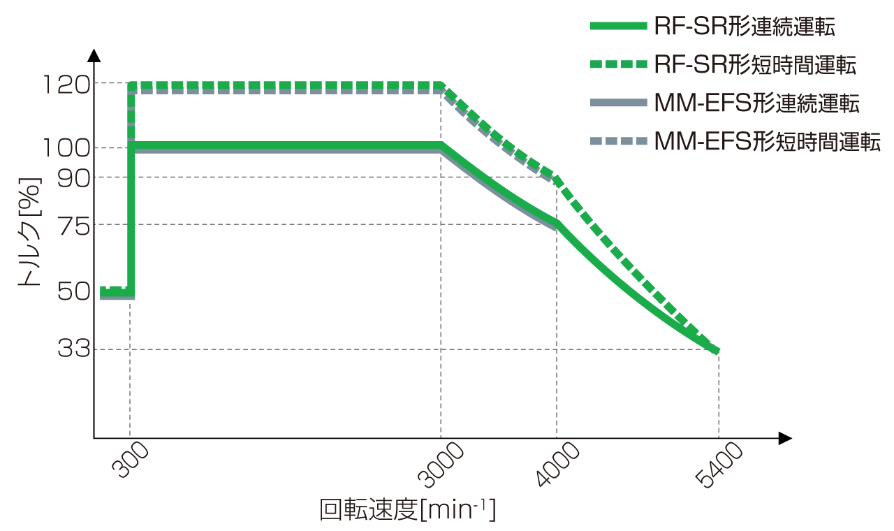 - 永久磁石レス方式であることに加え、同期リラクタンスモータに最適な当社独自のインバータ制御技術の開発により、最高5,400min -1 までの高速運転が可能です。既存ラインアップSF-PR形、MM-EFS形と比較したトルク特性は以下の通りです。