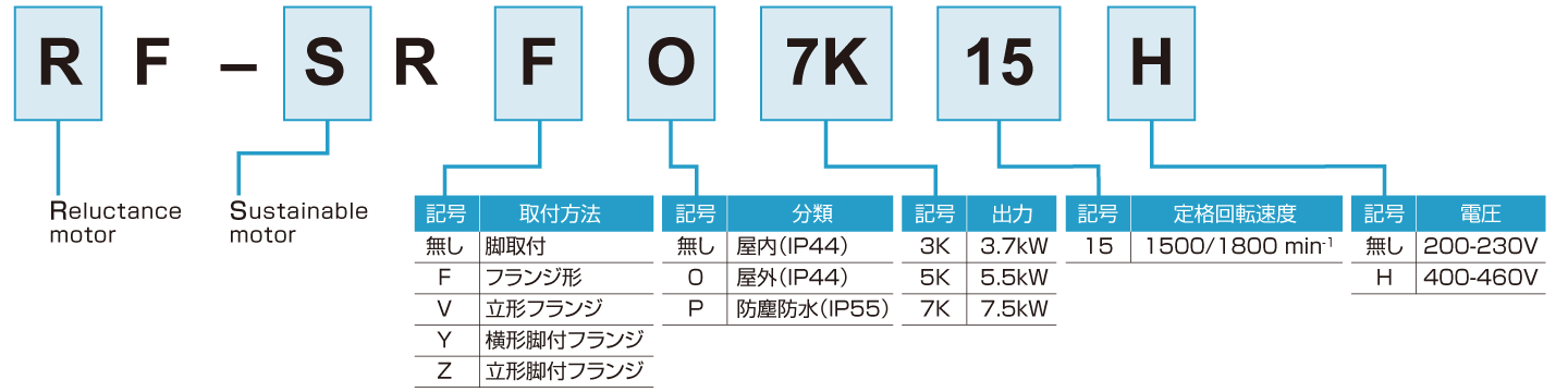 三相モータ サステナブルモータ RF-SR形 形名構成・仕様 定格1500/1800min-1(国内向け)