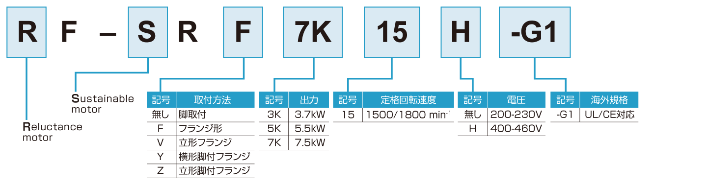 三相モータ サステナブルモータ RF-SR形 形名構成・仕様 定格1500/1800min -1 (UL/CE海外規格対応)