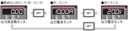 モニタする項目を出力周波数、出力電流、出力電圧に切り替えます。