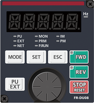 を押すと停止します。表示部の周波数値がPr.8 減速時間 に従って小さくなり“0.00”(0.00Hz)を表示し、モータは運転を停止します。