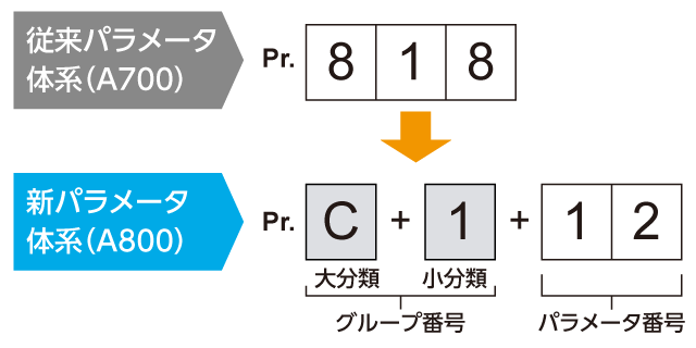 操作パネルのモード選択で直感的で、分かりやすい設定が可能なグループパラメータ方式に変更できます。(初期値は従来体系)
