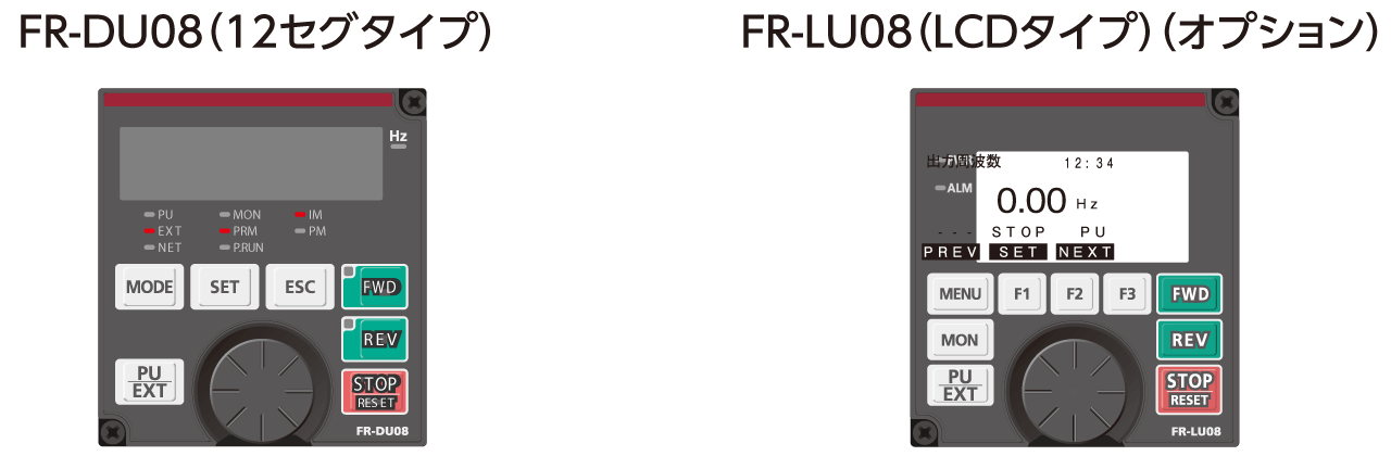 操作パネル(FR-DU08)は、より自然な文字表示となるよう5桁×12セグを採用。さらに漢字やメニュー表示が可能なLCDパネルを採用したオプションの液晶操作パネル(FR-LU08)を用意しています。