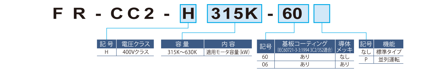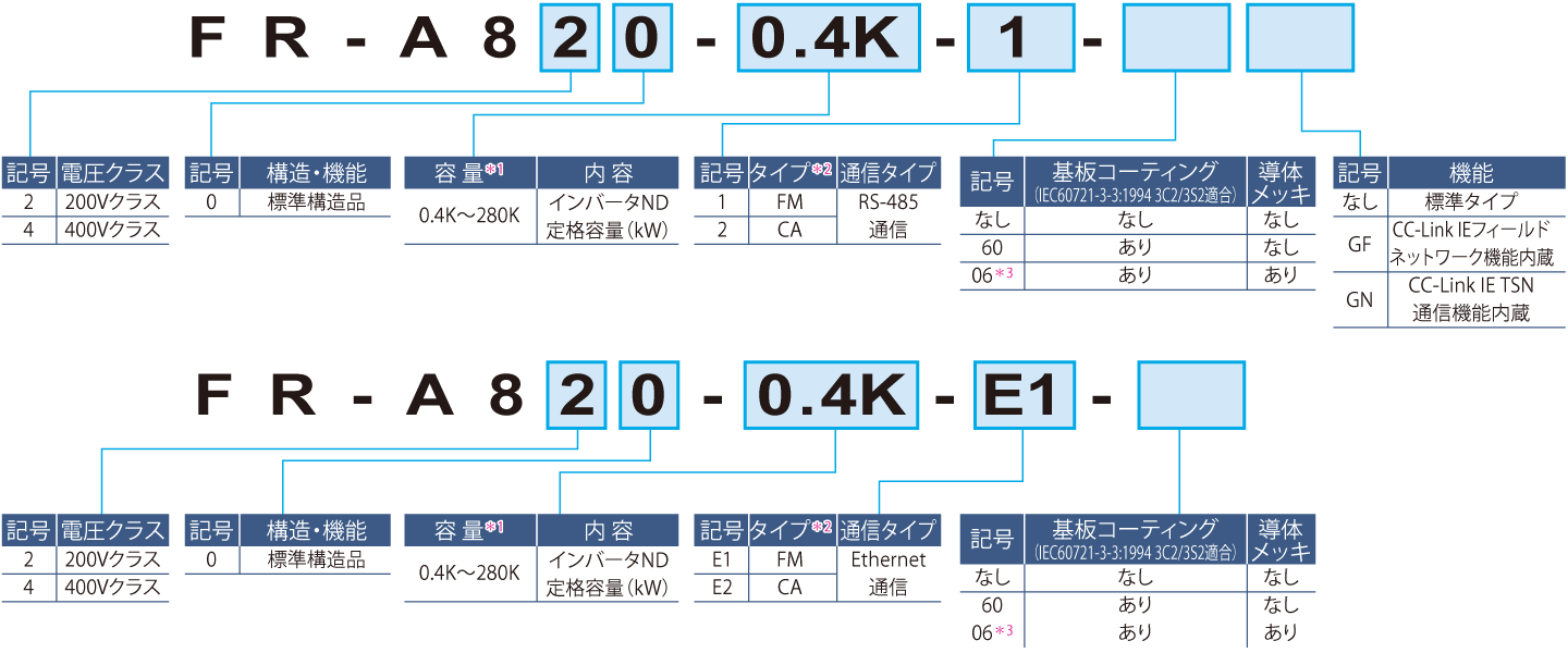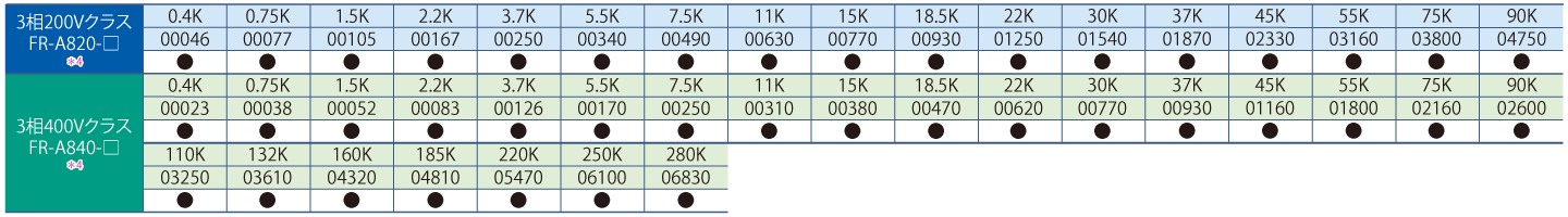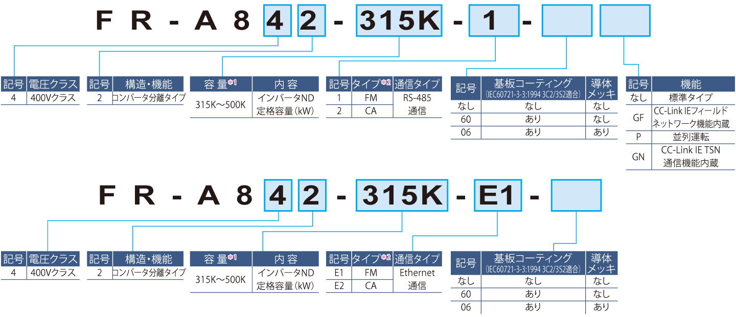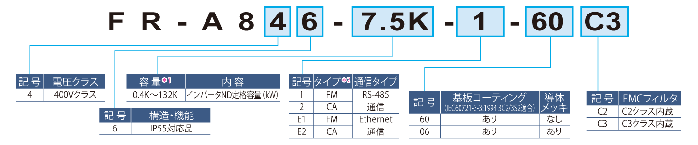 (FR-A842-P、FR-A846はLD定格、ND定格のみの対応ですが、形名は標準構造品と同一です。) - *2タイプにより下表のとおり仕様が異なります。