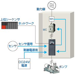 入力MC信号、ワットアワーメータ信号、センサ信号など制御盤(リレー盤等)を介していた信号を直接インバータに取り込み、制御できます。リレーなどを使うことなく状況に応じてファンを制御できます。また制御電源用に外部DC24V電源を使用することで、主回路電源の有無に関わらず入力MC信号をON/OFFできます。インバータ停止中でも入力電源をOFFできるため、省エネになります。