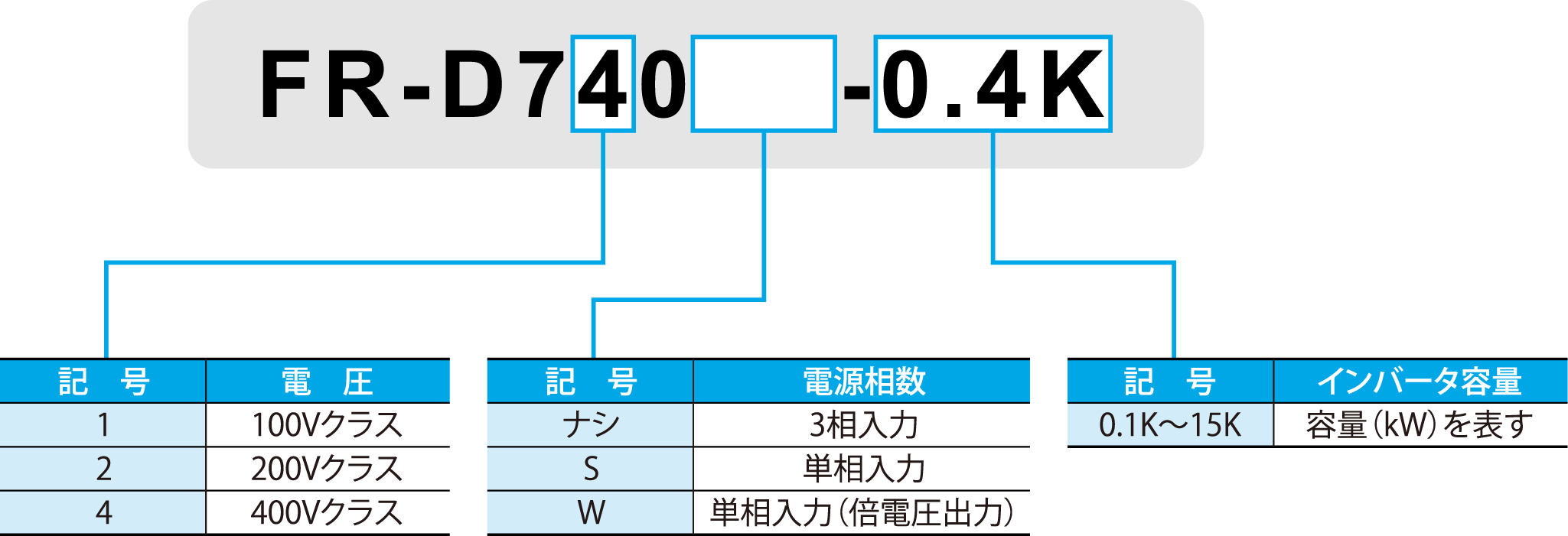 | 3相400V | FR-D740-□K | ― | ― | ● | ● | ● | ● | ● | ● | ● | ● | ● |