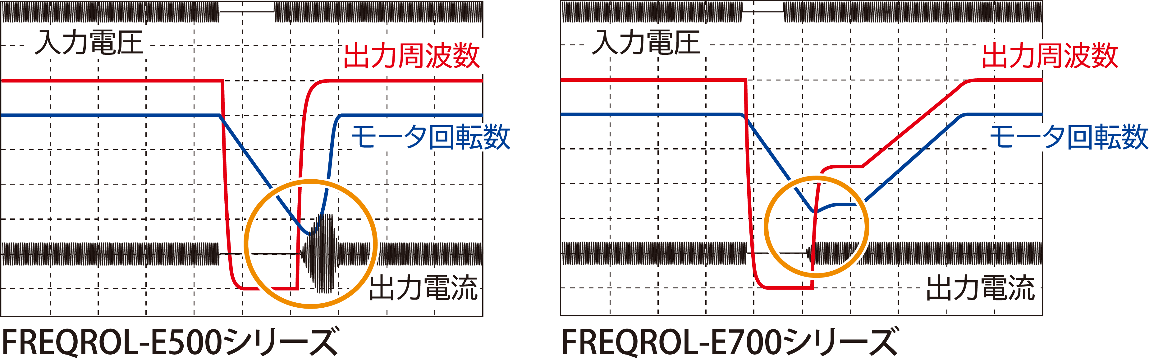 フリーラン速度を検出(周波数サーチ機能)するため再始動時のモータ回転の引き込みがなく、出力電流も少なくスムーズに再始動します。