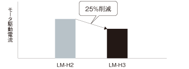 LM-H3シリーズでは、磁石形状の最適化と新規磁気設計により、モータ駆動電流を25%削減*。装置の省電力化を実現します。また、可動子質量を従来機種から約12%軽量化*。可動部を駆動させるためのエネルギを削減できます。