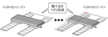 LM-H3シリーズでは、固定子/可動子の幅寸法を従来機種と比較して10%削減。また、推力/電流比をアップしているため、使用するサーボアンプの容量低減が可能になり、装置の小形化 (材料の削減) に貢献します。
