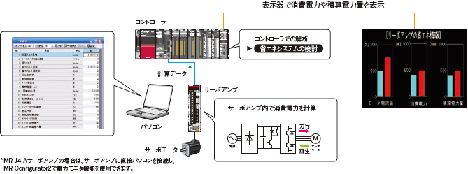 サーボアンプ内での速度や電流などのデータから力行/回生電力を計算。MR Configurator2で消費電力などのモニタができます。