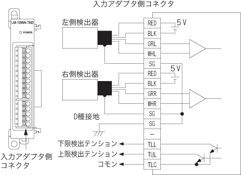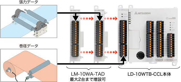 LM-10WA-TADは、LX7-FまたはLX-TD/LX-TD-928形張力検出器と歪みゲージ式張力センサの2タイプに対応しており、左右張力センサをセットで1チャンネルとしてLE-10WTA-CCL/LD-10WTB-CCL/LM-10WA-CCLに増設することができます。