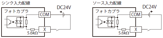 無電圧接点入力 シンク:NPNオープンコレクタトランジスタ ソース:PNPオープンコレクタトランジスタ |