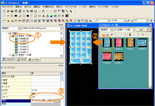 ワークスペースで①のキーを選択するか、②のライブラリ一覧からキーを選択して、画面にキーを配置し、③ステートOFFを選択します。(デフォルトはOFFに設定されています。)