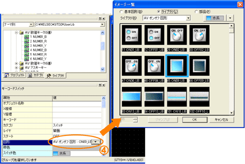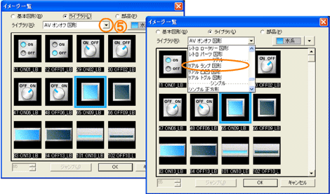 イメージ一覧の⑤の「ライブラリ」の『▼』で変更したい図形の種類を選択します。