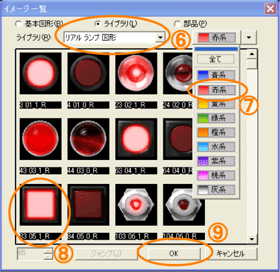 ライブラリの⑥で『リアル ランプ図形』を選択後、⑦の色指定で『赤系』を選択、⑧の図形を選択し、⑨の『OK』を選択します。