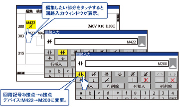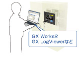 GOTとパソコンを接続し、GOTを経由して、GX Works2・GX LogViewerなどでプログラミングや立ち上げ・調整作業ができます。盤を開けたり、ケーブルを付け替える手間がかかりません。