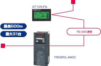 GOTにインバータを最長500m、最大31台接続できます。FREQROL-A800は、GOT接続用の通信パラメータを自動設定できるため、簡単に接続できます。