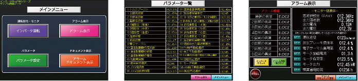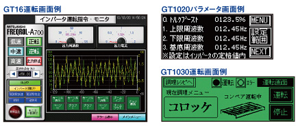 GOTで運転指令やパラメータ設定ができます。GT1020/GT1030は、画面ごとに3色のバックライトを切り換えできるので、オペレータにわかりやすく表示できます。