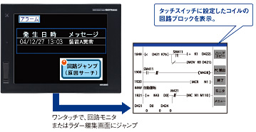 タッチスイッチにCNC C70のシーケンスプログラム名とコイル番号を設定し、該当するコイルの回路ブロックを直接表示できます。アラーム画面からスムーズなトラブル対応が可能です。