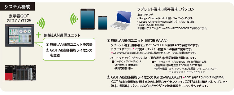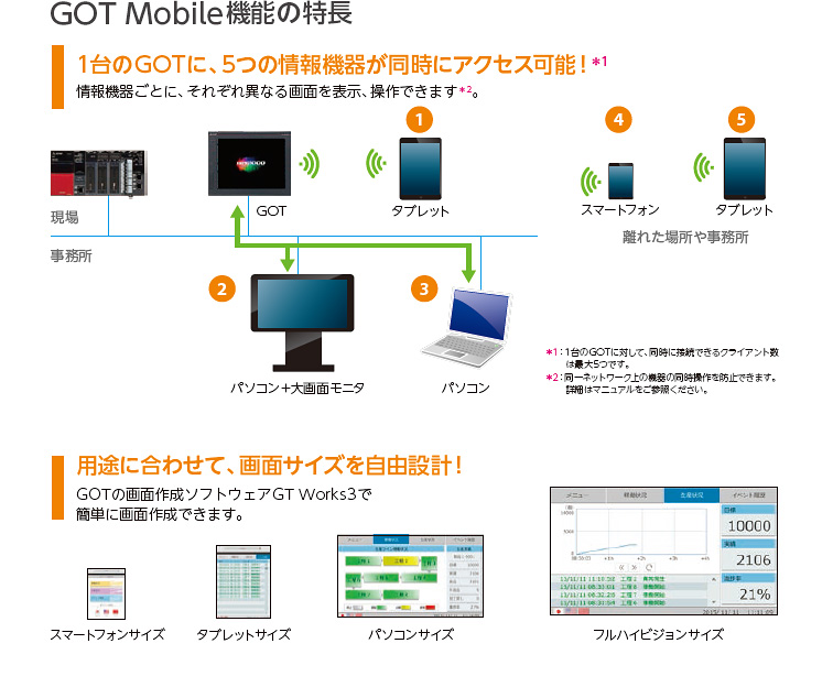 GOT Mobile機能クイックスタートガイド <掲載内容> GOT2000シリーズの新機能『GOT Mobile機能』を使って、タブレットなどのモバイル機器のWebブラウザから、GOTを通して設備の状態をモニタするまでの手順をご紹介。 |