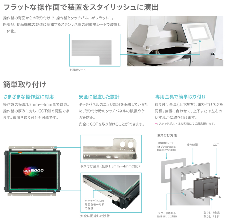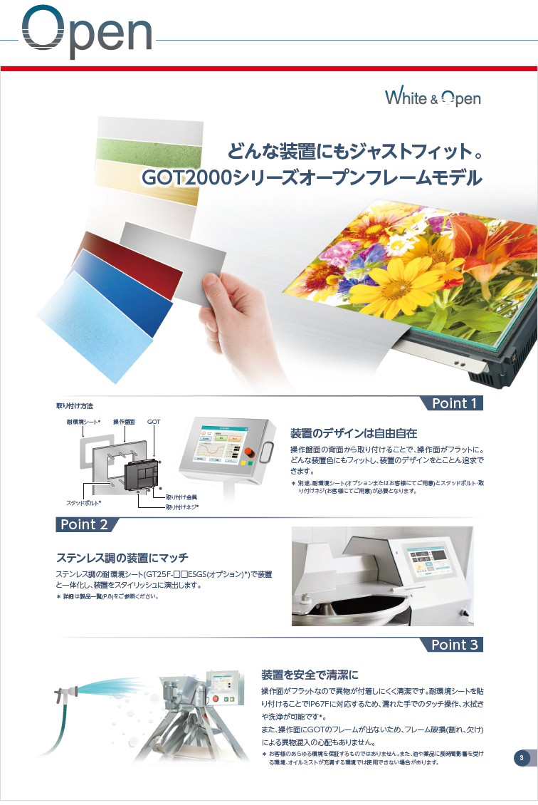 可能性を切り拓くWhite&Open <掲載内容> 現場をより美しく、より清潔に。GOT2000シリーズホワイトモデル どんな装置にもジャストフィット。GOT2000シリーズオープンフレームモデル |