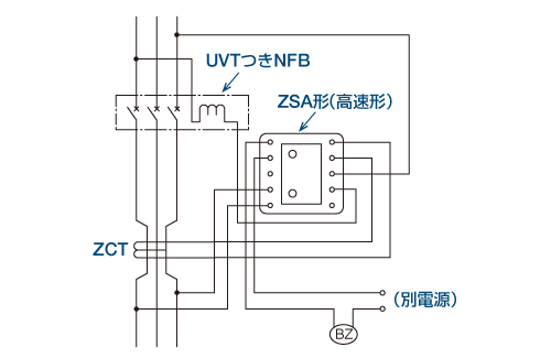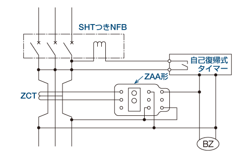 ZBA・ZHA形を使用し、制御電源はNFBの負荷側に接続してください。(漏電表示はしません)