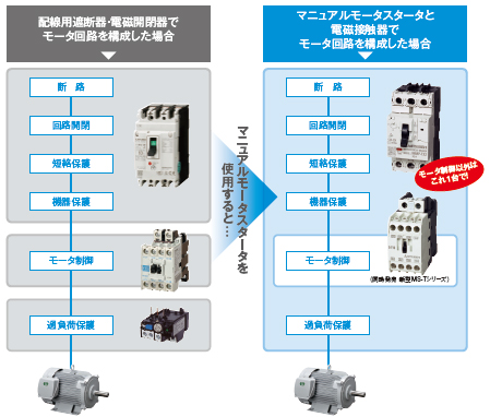 モータ回路には遮断・回路開閉・短絡保護・機器保護・モータ制御・過負荷保護と多くの機能を必要としています。一般的に配線用遮断器・電磁接触器・サーマルリレーで構成されるモータ回路が採用されていますが、各機種で役割が分断されています。一方、マニュアルモータスタータ・電磁接触器で構成されるモータ回路では、モータ制御のみ電磁接触器にて役割を担い、他はすべてマニュアルモータスタータにて役割を担います。