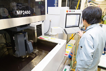 その実現のために導入された三菱電機の放電加工機は、細穴放電加工機からワイヤ放電加工機まで総数10台以上になる。主力となっているのが、2015年から3年連続で一台ずつ導入してきた3台のワイヤ放電加工機「MP2400」だ。