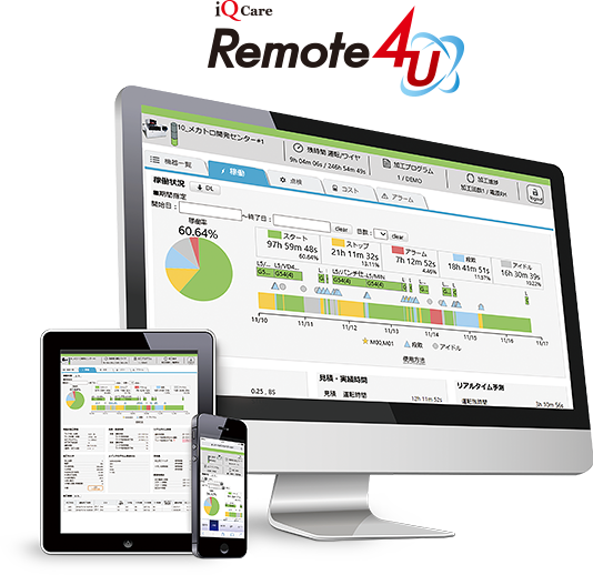 加工機の状況を遠隔で確認できる、リモートサービス【iQ Care Remote4U】。生産・保守をとりまく最新情報を「いつでも、どこでも」、製造現場を支援します。生産プロセス改善やコスト低減に貢献します。