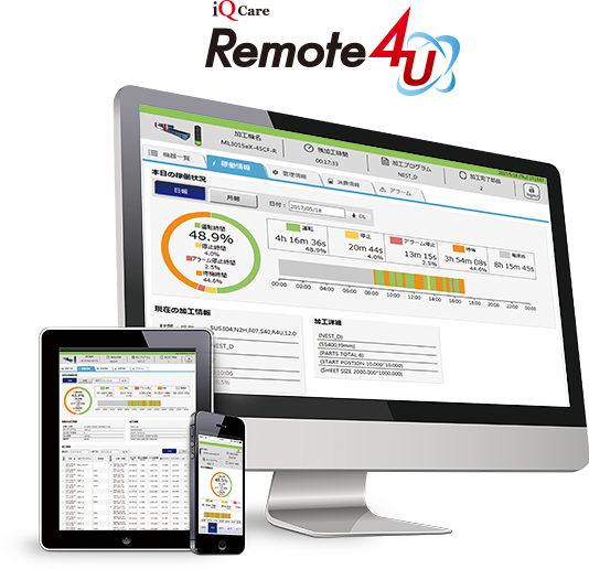 加工機の状況を遠隔で確認できるリモートサービス。生産・保守をとりまく情報を「いつでも、どこでも」支援。生産プロセス改善やコスト低減に貢献。