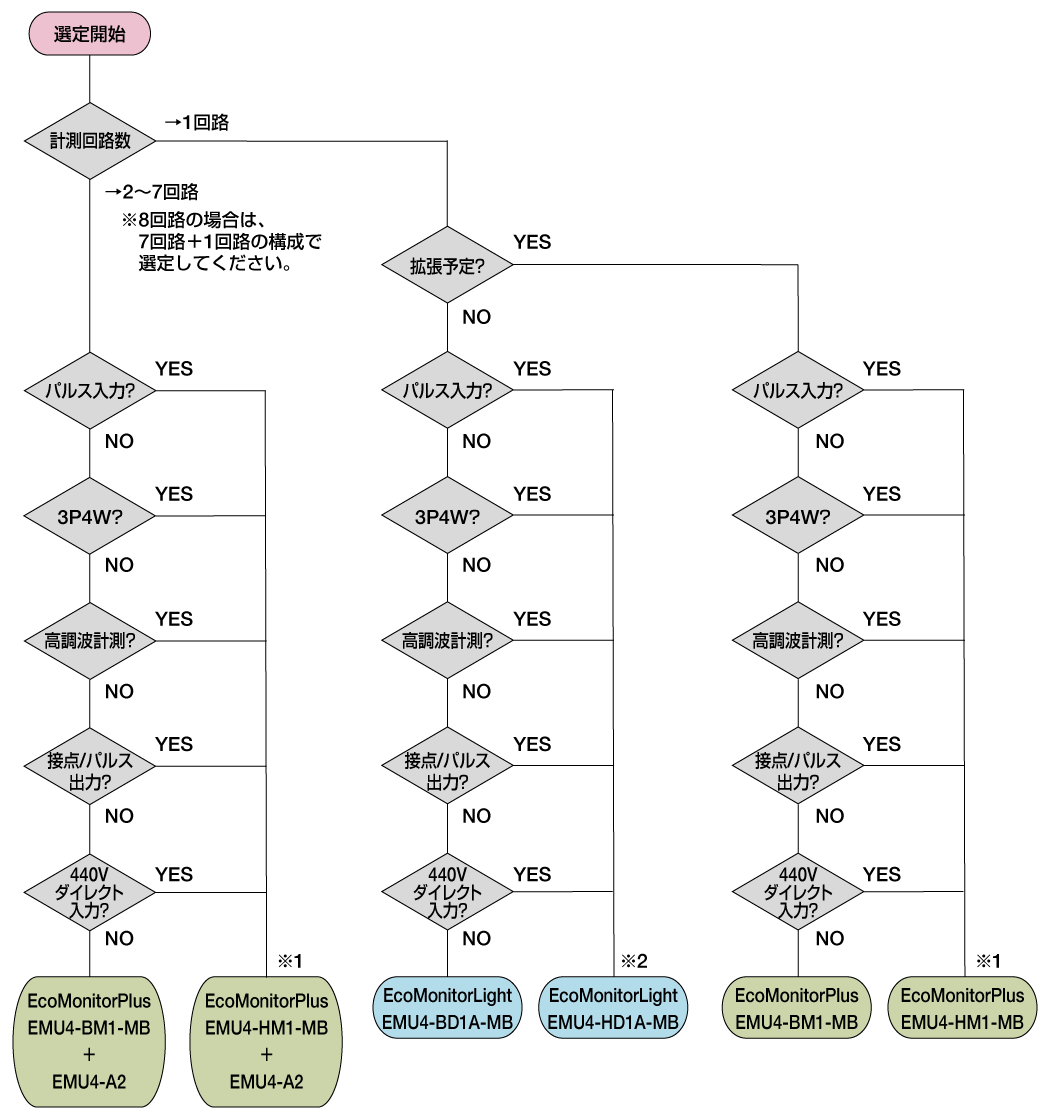 EcoMonitorLightおよびEcoMonitorPlusへ更新する際の機種選定の考え方をフローで示します。