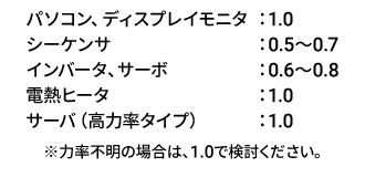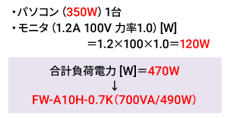 接続機器の消費電力(VA、W)を換算し、出力容量(VA、W)ともに消費電力(VA、W)の総和より大きいUPSを選定します。