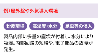 UPS内部への水分や塵埃の侵入は、製品の誤動作や故障の原因となります。汚染が見込まれる環境下でご使用される場合、UPSを汚染原因から隔離するなどの対策が必要です。耐環境仕様品※1、3 および基板コーティング品(特殊品)※2、3 もご用意ございます。最寄りの支社・代理店にご照会ください。