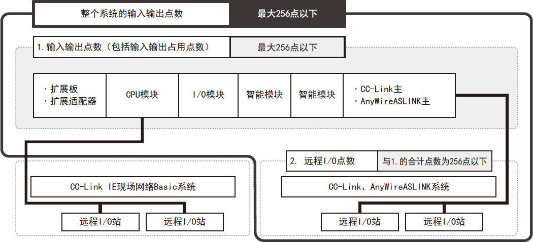 包括远程I/O主站模块连接,系统整体的最大控制点数为256点。