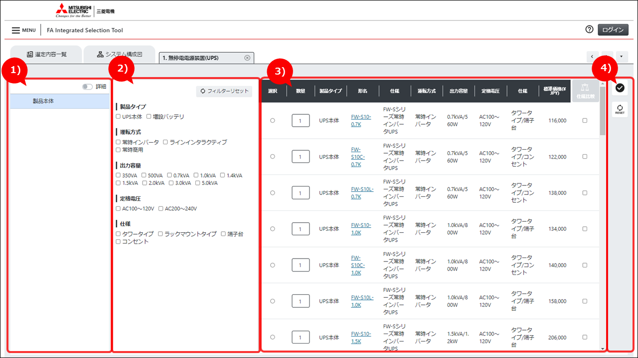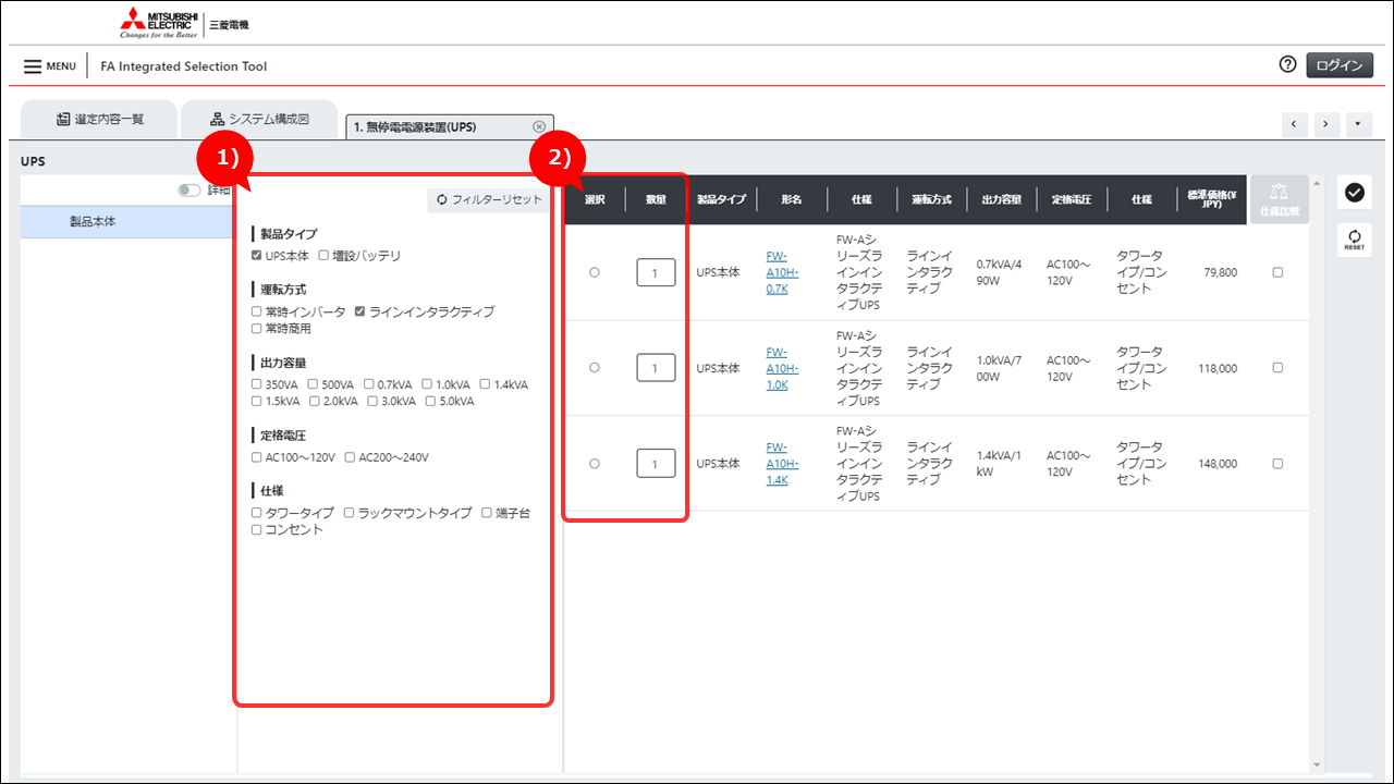 1)製品の絞り込み条件を指定します。製品タイプ、定格容量などから絞込み検索が行えます。
